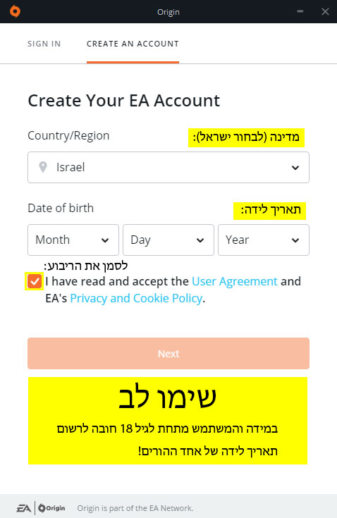 (במידה וזה נותן הודעה שקשורה לTechnical Difficulties אפשר לעשות את ההרשמה ישירות מהאתר של Origin באותה צורה בדיוק לפי המדריך)
