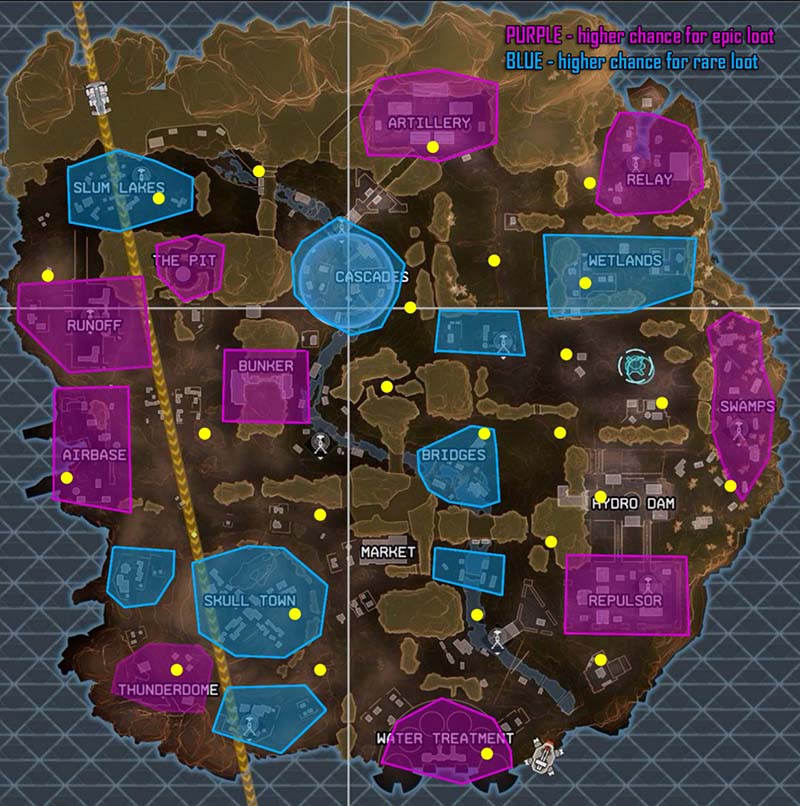 בנוסף בתחילת המשחק יהיה סימון על המפה בעיגול כחול בו יש סיכוי למצוא נשק Legendary והסימון נראה ככה: